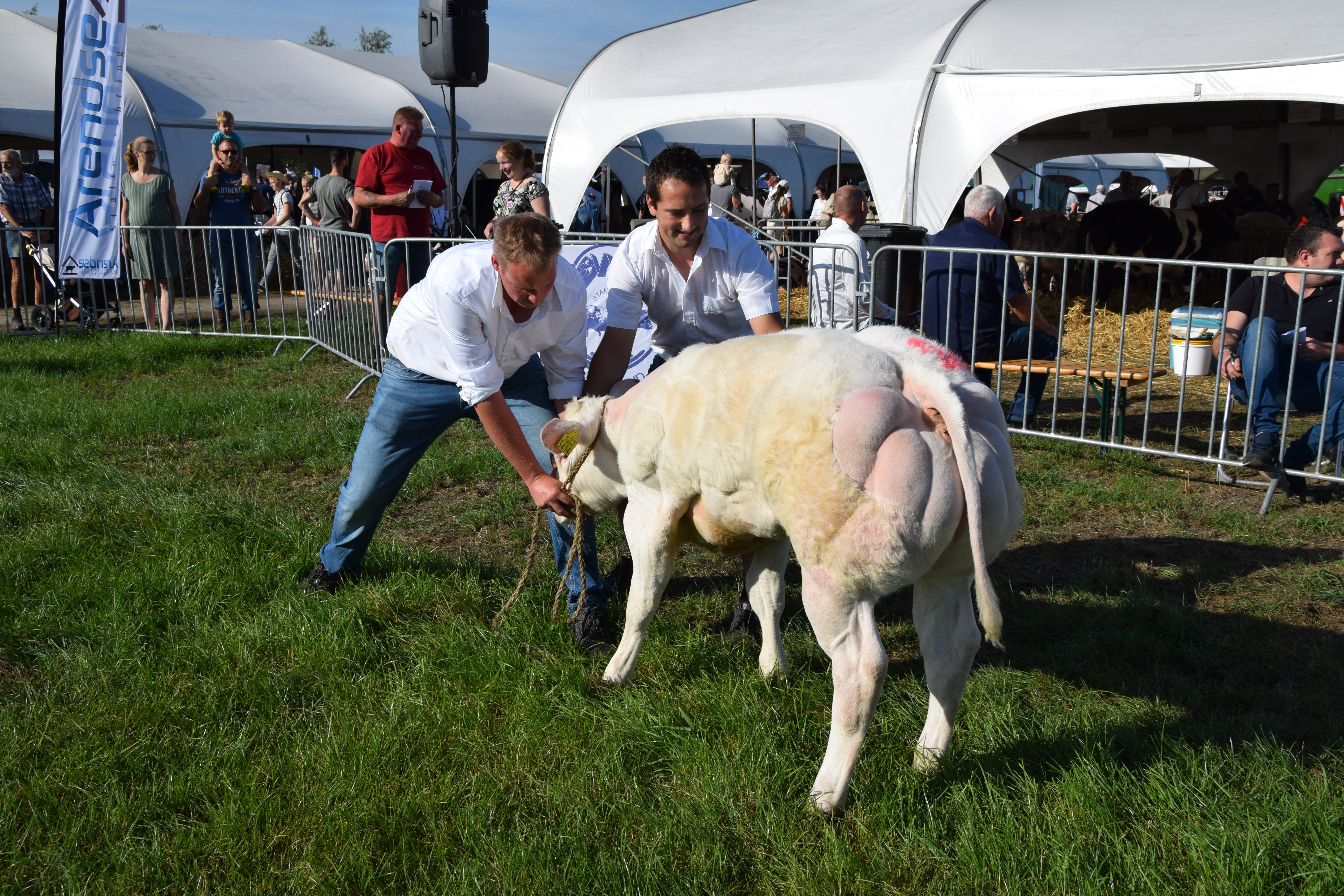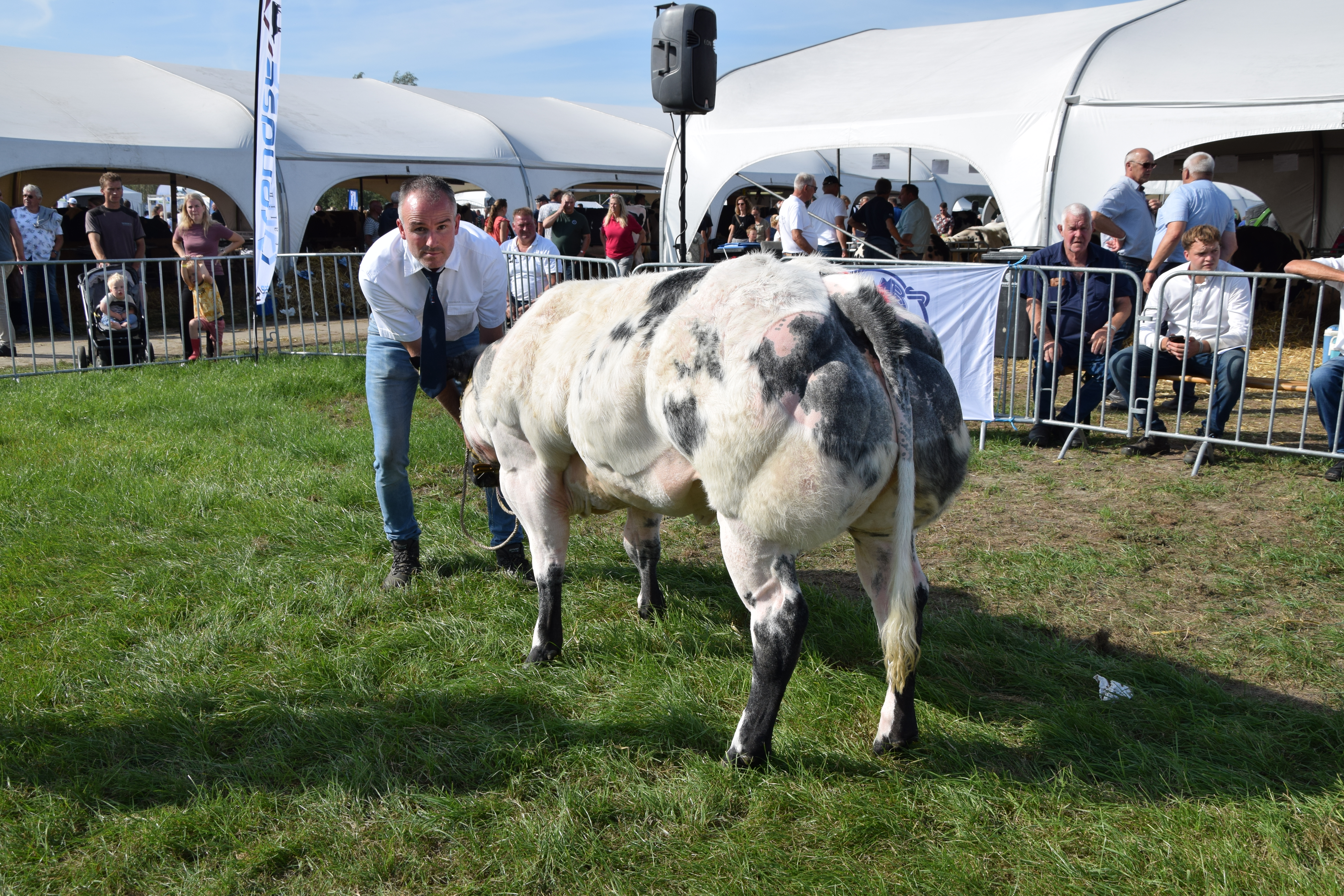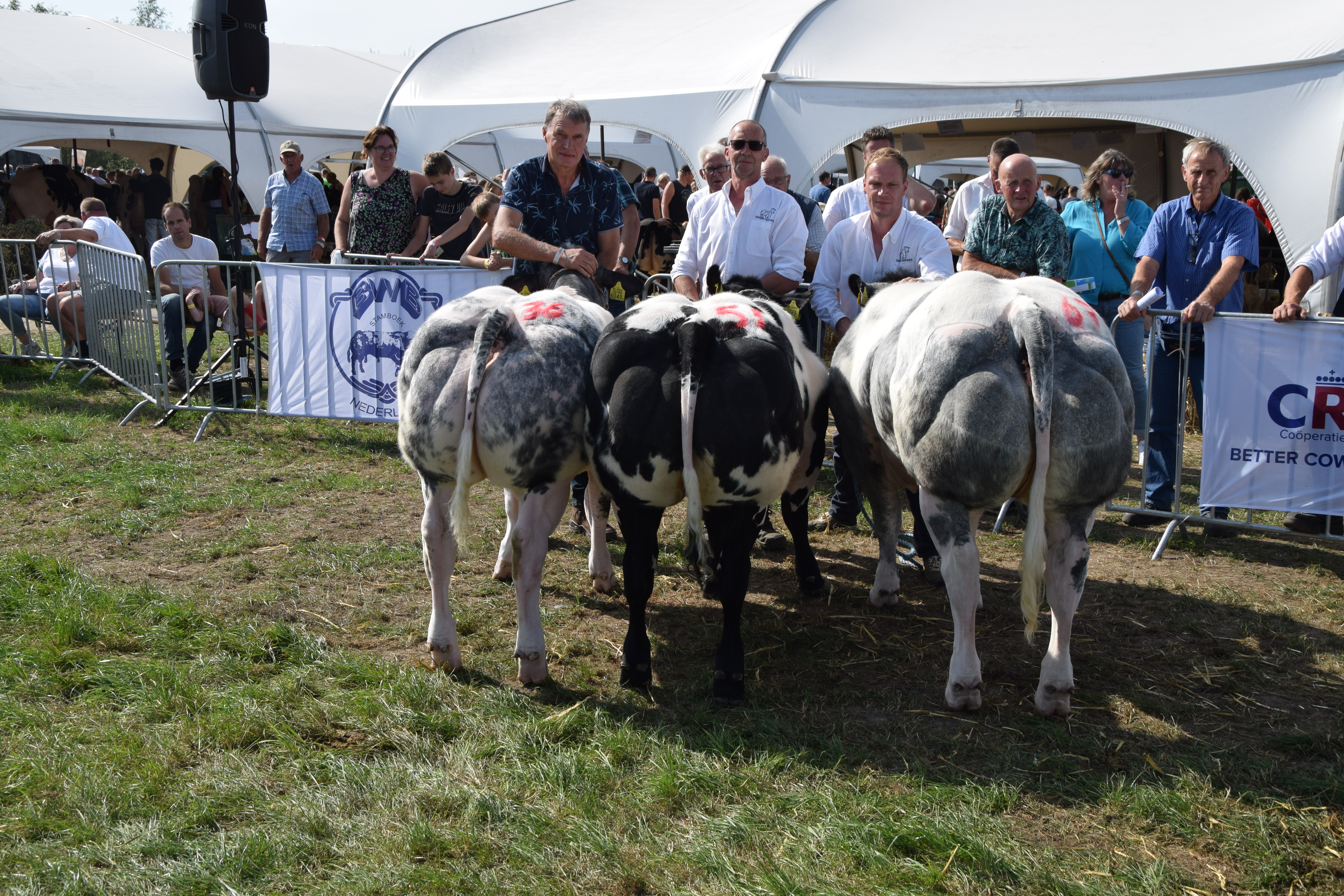 Fokkerij 18 sep 2023 Foto: Nationale Bwb-prijskamp, Hoornaar Alle rubriekswinnaar en kampioenen van de nationale keuring Belgisch witblauw in Hoornaar (2023). Kampioenen mannelijk kampioen vrouwelijk