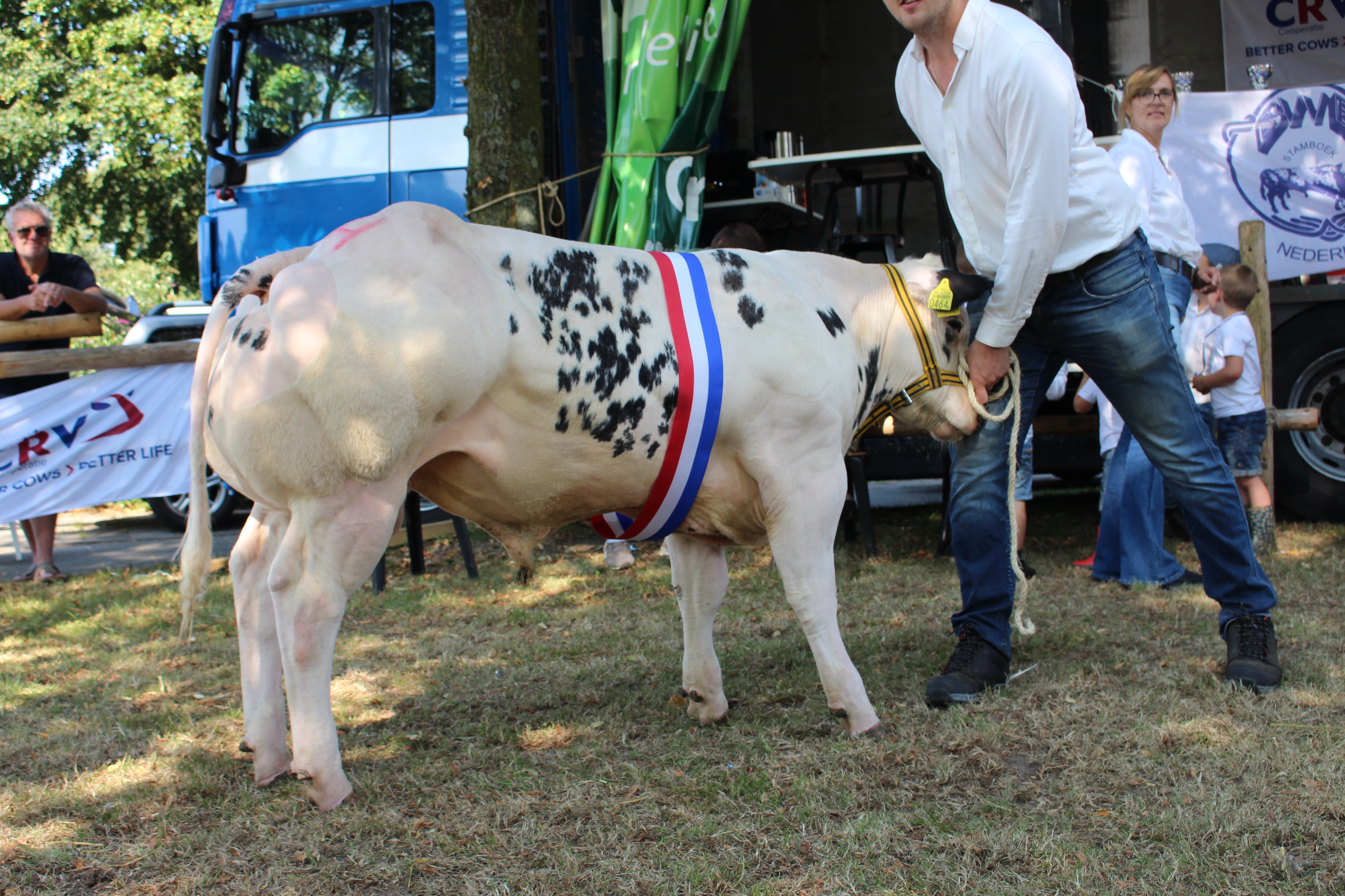 Spannend was de strijd om de titel bij de koeien. Want daar liep ook Nefertete van Daisel, die vorig jaar voor Hoogeveen de titel opeiste. Maar dit jaar liep het anders voor de flink uitgezwaarde Carameldochter. Xinthia (v. Futé) van Wolters kreeg vanwege meer fijnheid in het vel de reservetitel en het was Bertha 473 die de hoofdprijs pakte. De Oularedochter werd tot grote vreugde van de familie Hunnekens uit Grashoek aangewezen als kampioene dankzij haar maat, mooi ronde rib en fijnheid in het skelet.
