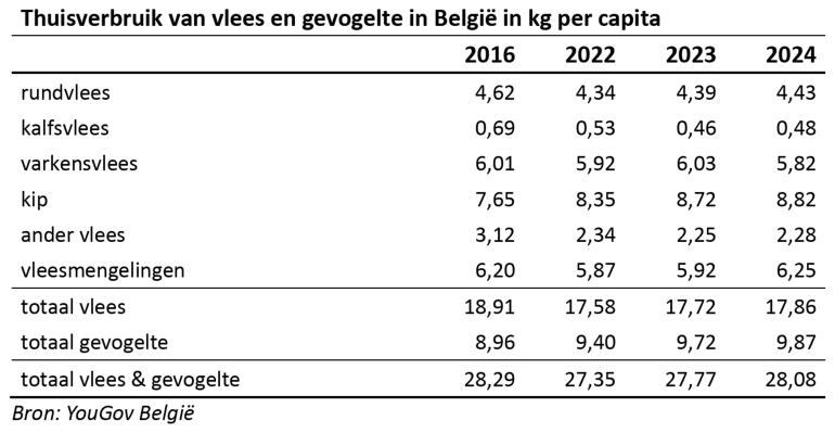 Het thuisverbruik van vlees en gevogelte zit voor het tweede jaar op rij in de lift. In 2024 aten Belgen gemiddeld 28,1 kg vlees en gevogelte per persoon, goed voor een stijging van 1% ten opzichte van het jaar ervoor. Dat blijkt uit een analyse van aankoopgegevens van 6.000 Belgische gezinnen door YouGov in opdracht van VLAM.