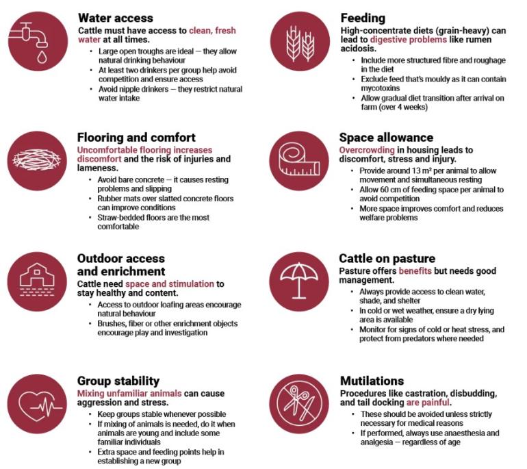 Volgens het advies van EFSA moeten runderen te allen tijde toegang hebben tot schoon, vers water. Grote open drinktroggen genieten de voorkeur, omdat ze natuurlijk drinkgedrag mogelijk maken. Op het gebied van voeding wordt in het rapport gewaarschuwd voor de risico’s van sterk geconcentreerde rantsoenen. Die kunnen namelijk leiden tot spijsverteringsproblemen zoals pensverzuring. Voldoende gestructureerde vezels en ruwvoer zijn essentieel. Ook moet voer dat verontreinigd is met mycotoxinen worden vermeden.