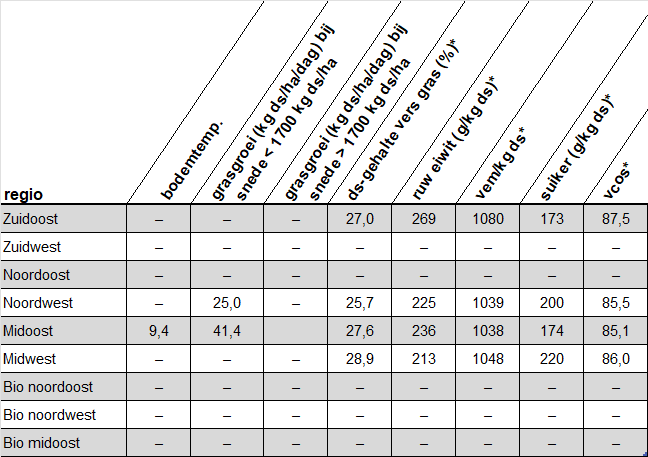 Bronnen: ABZ Diervoeding, Agrifirm (Grasmonitor)1, AgruniekRijnvallei, CAV Den Ham, De Heus (kijkopgras.nl)1, Schothorst Feed Research, ForFarmers (VersGrasMonitor), Voergroep Zuid, Eurofins Agro, Grip op Gras, Groeikracht, Aeres Hogeschool1, Netwerk praktijkbedrijven, Koe en Eiwit , Wageningen Livestock Research en Koeien & Kansen.