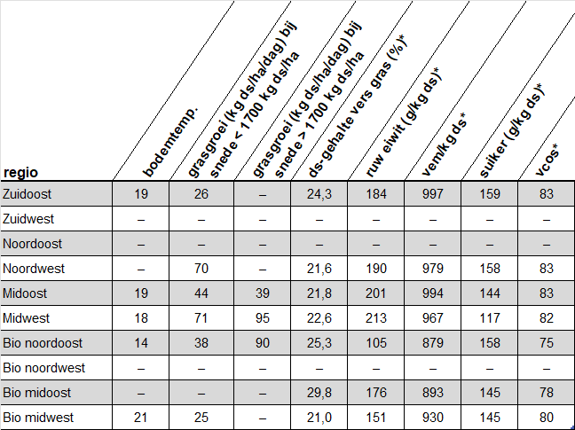 Bronnen: ABZ Diervoeding, Agrifirm (Grasmonitor), AgruniekRijnvallei, CAV Den Ham, De Heus (kijkopgras.nl)1, Schothorst Feed Research, ForFarmers (VersGrasMonitor), Voergroep Zuid, Eurofins Agro, Grip op Gras, Groeikracht, Aeres Hogeschool1, Netwerk Praktijkbedrijven, Wageningen Livestock Research en Koeien & Kansen.