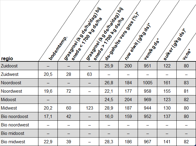 Bronnen: ABZ Diervoeding, Agrifirm (Grasmonitor), AgruniekRijnvallei, CAV Den Ham, De Heus (kijkopgras.nl)1, Schothorst Feed Research, ForFarmers (VersGrasMonitor), Voergroep Zuid, Eurofins Agro, Grip op Gras, Groeikracht, Aeres Hogeschool1, Netwerk Praktijkbedrijven, Wageningen Livestock Research en Koeien & Kansen.