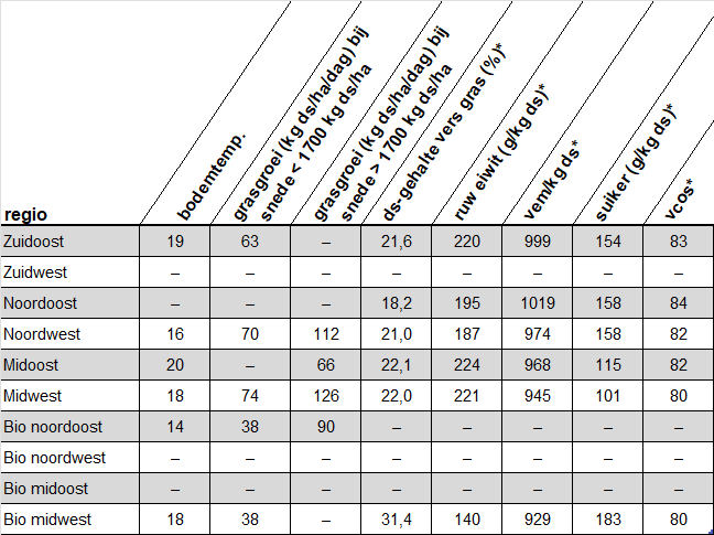 Bronnen: ABZ Diervoeding, Agrifirm (Grasmonitor), AgruniekRijnvallei, CAV Den Ham, De Heus (kijkopgras.nl)1, Schothorst Feed Research, ForFarmers (VersGrasMonitor), Voergroep Zuid, Eurofins Agro, Grip op Gras, Groeikracht, Aeres Hogeschool1, Netwerk Praktijkbedrijven, Wageningen Livestock Research en Koeien & Kansen.