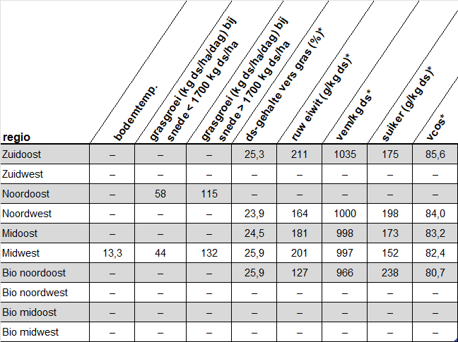 Bronnen: ABZ Diervoeding, Agrifirm (Grasmonitor), AgruniekRijnvallei, CAV Den Ham, De Heus (kijkopgras.nl)1, Schothorst Feed Research, ForFarmers (VersGrasMonitor), Voergroep Zuid, Eurofins Agro, Grip op Gras, Groeikracht, Aeres Hogeschool1, Netwerk Praktijkbedrijven, Wageningen Livestock Research en Koeien & Kansen.
