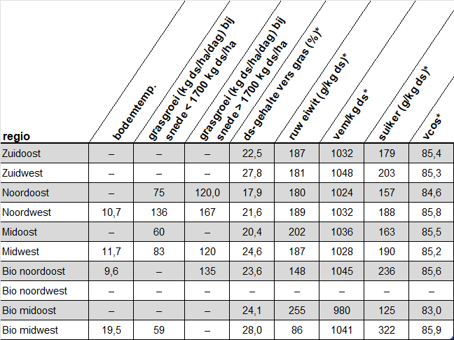 Bronnen: ABZ Diervoeding, Agrifirm (Grasmonitor), AgruniekRijnvallei, CAV Den Ham, De Heus (kijkopgras.nl)1, Schothorst Feed Research, ForFarmers (VersGrasMonitor), Voergroep Zuid, Eurofins Agro, Grip op Gras, Groeikracht, Aeres Hogeschool1, Netwerk Praktijkbedrijven, Wageningen Livestock Research en Koeien & Kansen.