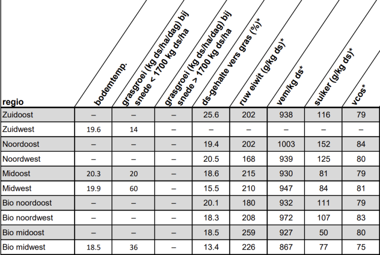 Bronnen: ABZ Diervoeding, Agrifirm (Grasmonitor), AgruniekRijnvallei, CAV Den Ham, De Heus (kijkopgras.nl)1, Schothorst Feed Research, ForFarmers (VersGrasMonitor), Voergroep Zuid, Eurofins Agro, Grip op Gras, Groeikracht, Aeres Hogeschool1, Netwerk Praktijkbedrijven, Wageningen Livestock Research en Koeien & Kansen.